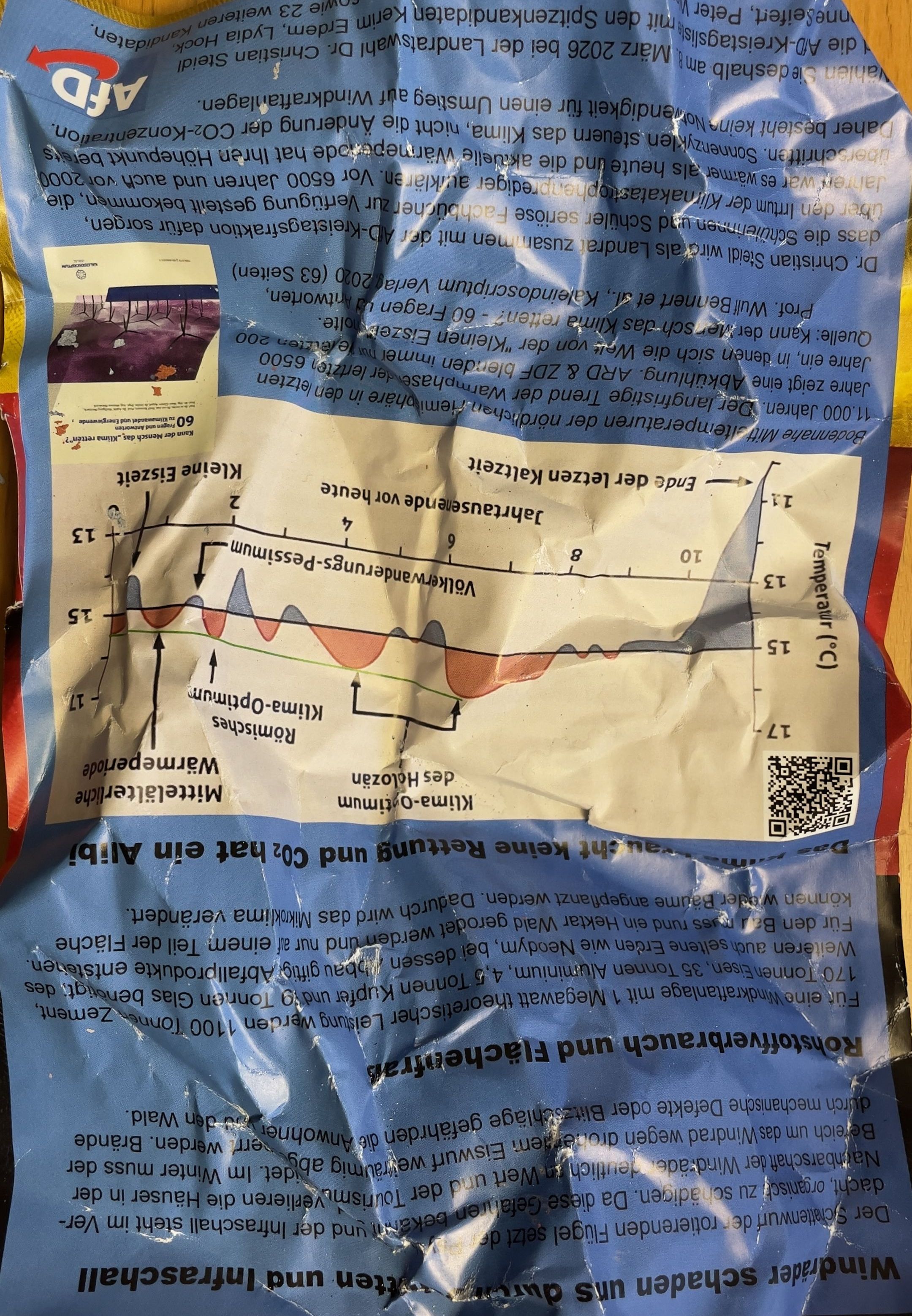 Die in dem Flyer gezeigte Kurve stammt von einer schematischen Zeichnung des renommierten Klimawissenschaftlers Christian-D. Schönwiese aus dem Jahr 1995, mit der dieser schematisch die Themperaturentwicklung nach der letzten Eiszeit (bewusst ohne menschliche Einflüsse) illustrierte. Er vereinfachte dafür die Messungen aus einem Eisbohrkern im Norden Grönlands aus den 1960er Jahren (Dansgaard, 1969). Schönwiese selbst sagt in seinen Vorträgen : “Offenbar ist insbesondere der Temperaturanstieg seit ca. 1965 nur anthropogen erklärbar.” (https://www.uni-frankfurt.de/109069947/Pr%C3%A4s_240.pdf). Man kann also zusammenfassen: